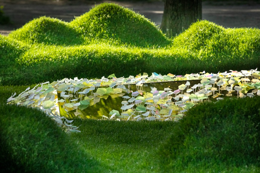 La sculpture centrale fonctionne comme un lac inversé. Le creux qui serait le fond est ici un volume qui s’élève 30cm du sol. Les jeux du reflets sur la surface brouillent les repères de surface, comme dans un tableau impressionniste, en hommage aux nymphéas de Monet. C’est un regard inversé, un morceau du soleil filtré par les feuilles aux verts translucides, interrompue par les taches blanches et jaune pâle des trouées de lumière vive. Un espace où le ciel et le sol se confondent, un ciel végétal et un sol solaire.